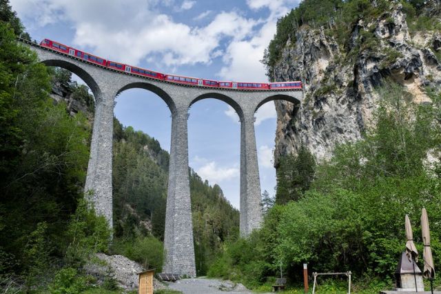 גשר האבן המפורסם המוביל את הרכבת אל תוך מנהרה החצובה בסלע. זהו אחד המקומות המצולמים ביותר באלפים.